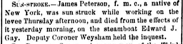 August 11, 1859 - Thursday. James Peterson, a "free man of color," collapsed while working on the levee and he was taken on board the Gay to recuperate.