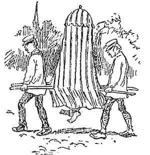 The "Establishment" is the property of France, and all the officers and servants are employes of the French Government. The bath-house is a huge and massive pile of white marble masonry, and looks more like a temple than anything else. It has several floors, and each is full of bath cabinets. There is every kind of bath--for the nose, the ears, the throat, vapor baths, tube baths, swimming baths, and all people's favorite, the douche. It is a good building to get lost in when you are not familiar with it. From early morning until nearly noon people are streaming in and streaming out without halt. The majority come afoot, but great numbers are brought in sedan chairs, a sufficiently ugly contrivance whose cover is a steep little tent made of striped canvas. You see nothing of the patient in this diving-bell as the bearers tramp along, except a glimpse of his ankles bound together and swathed around with blankets or towels to that generous degree that the result suggests a sore piano leg. By attention and practice the pallbearers have got so that they can keep out of step all the time--and they do it. As a consequence their veiled chum goes rocking, tilting, swaying along like a bell-buoy in a ground swell. It makes the oldest sailor sea-sick to look at that spectacle.