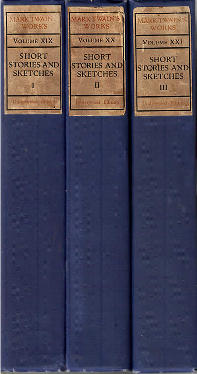 ![]() Spines for Volumes 19, 20, and 21 from Underwood Edition identifying the volumes only as Short Stories and Sketches |
