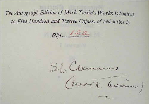 The Autograph Edition of The Writings of Mark Twain provides a basis of comparison for subsequent, and often less expensive, editions. It is the foundation upon which later editions were built into the 20th century. The Autograph Edition was limited to 512 sets. The size of the pages were 8vo.(8.5" x 6.0"). Each volume was numbered on the spine and each volume featured a flyleaf identifying the edition.